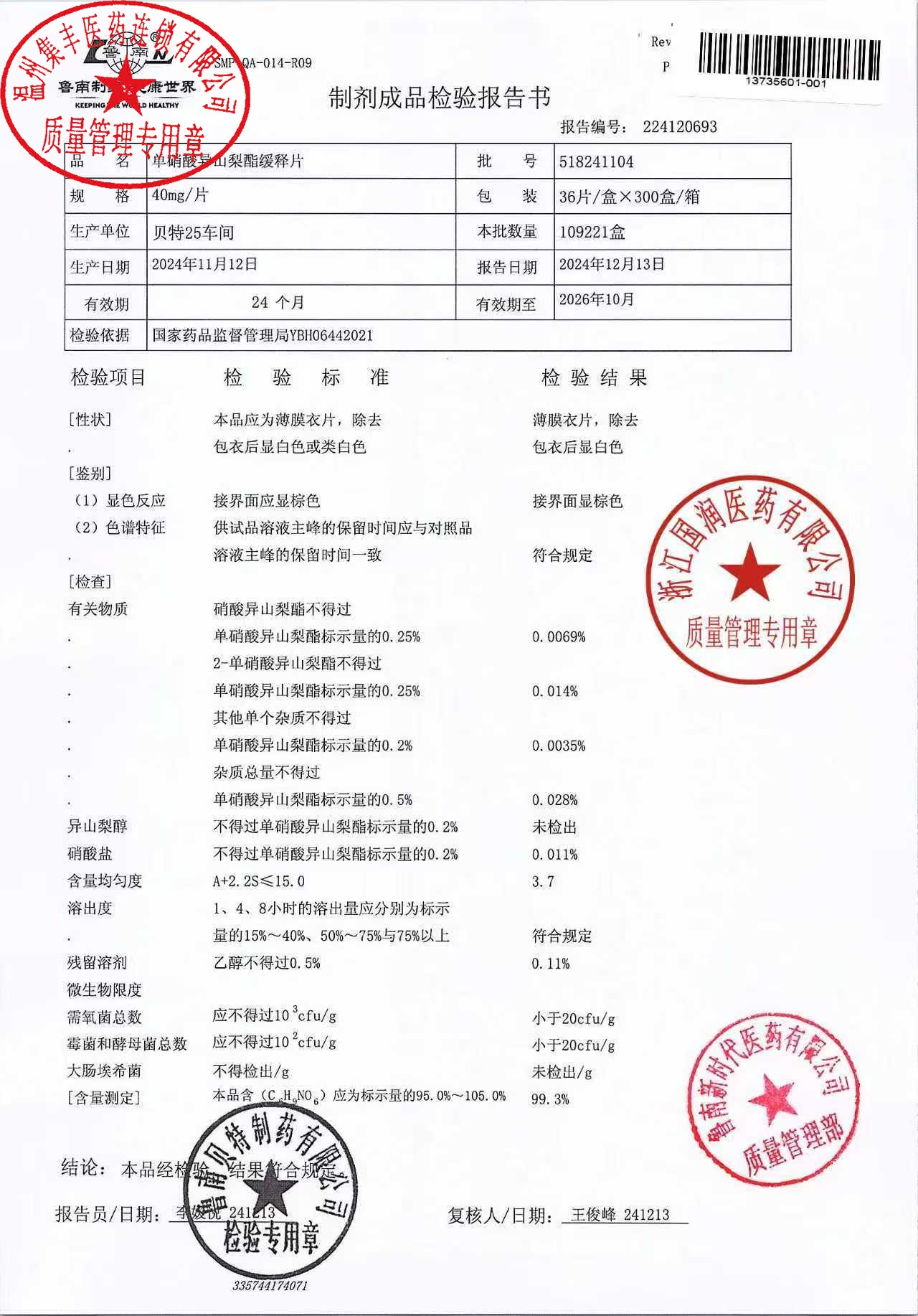 1 | 26736 | 单硝酸异山梨酯缓释片(欣康) | 40mg*36片 | 518241104 | 盒 | 鲁南贝特制药有限公司 |  | 打包下载 |