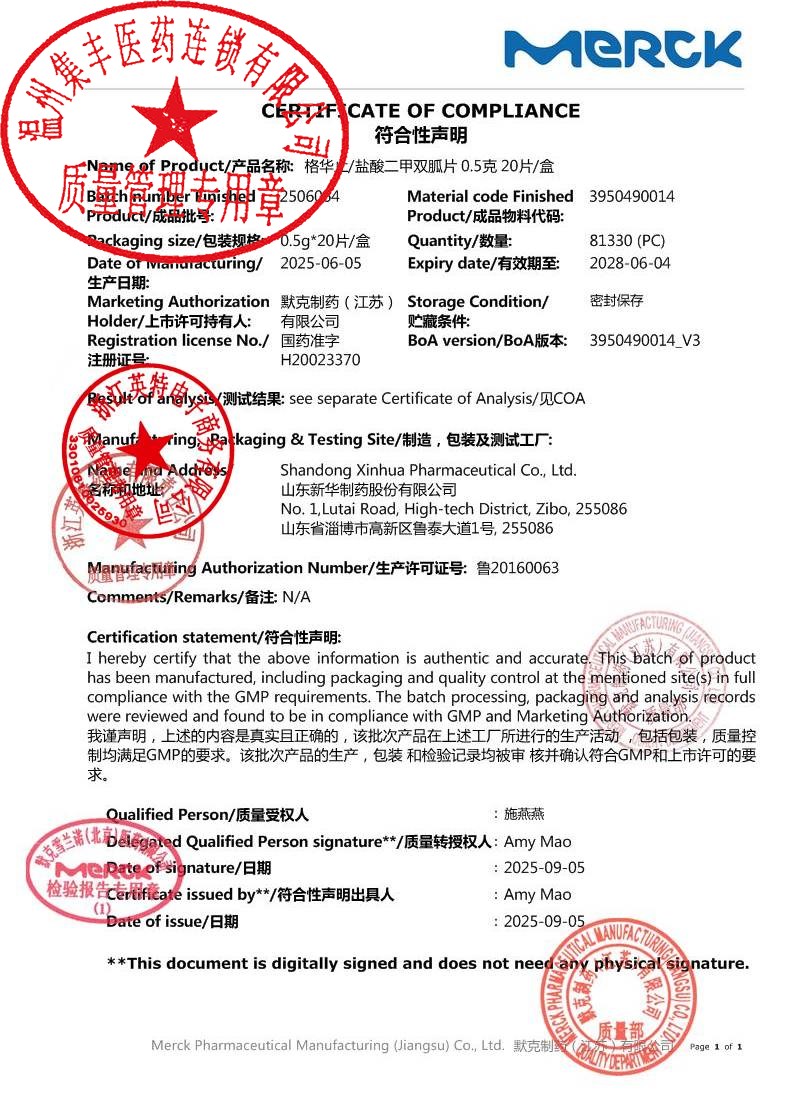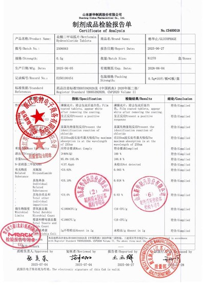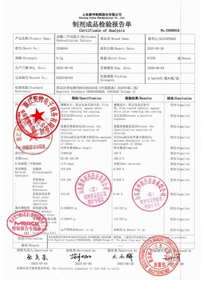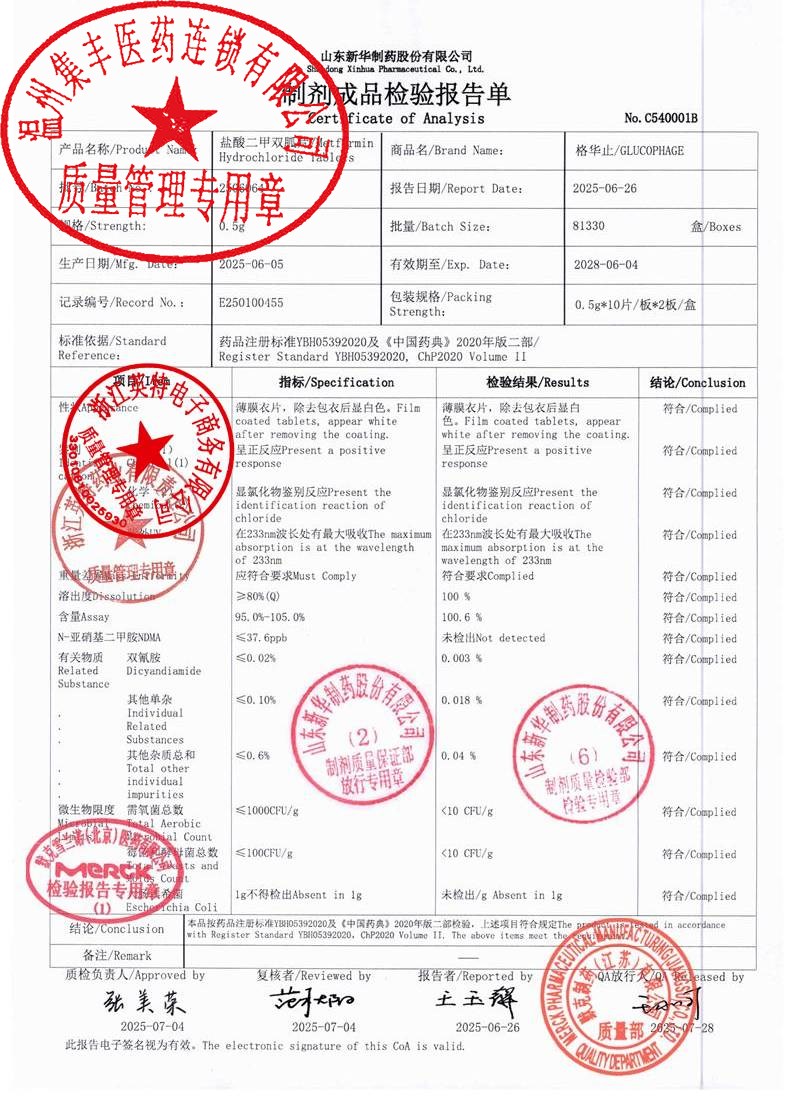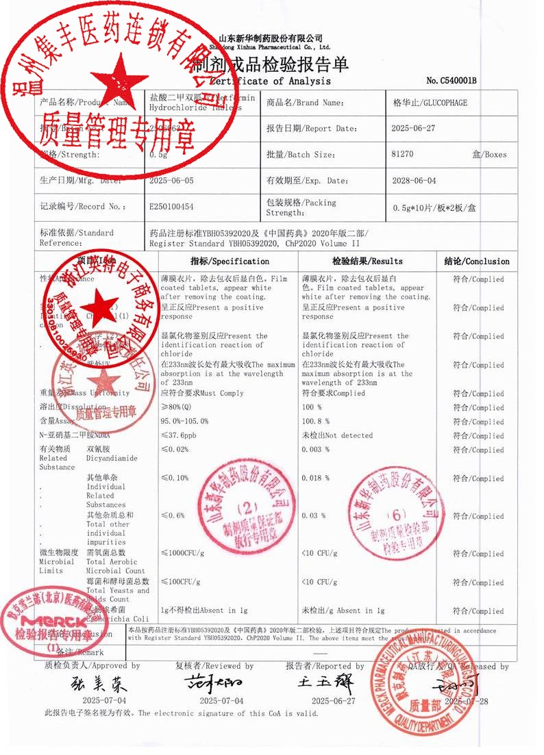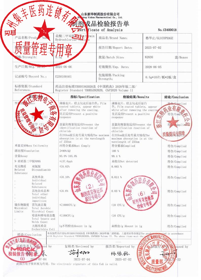 | 10 | 20355 | 盐酸二甲双胍片(格华止) | 0.5g*20片 | 2506078 | 盒 | 中美上海施贵宝制药有限公司 |   | 打包下载 |