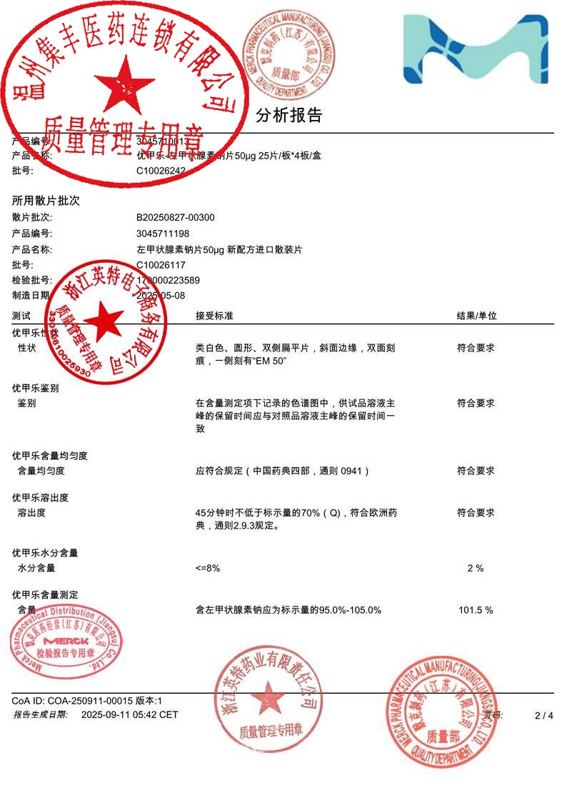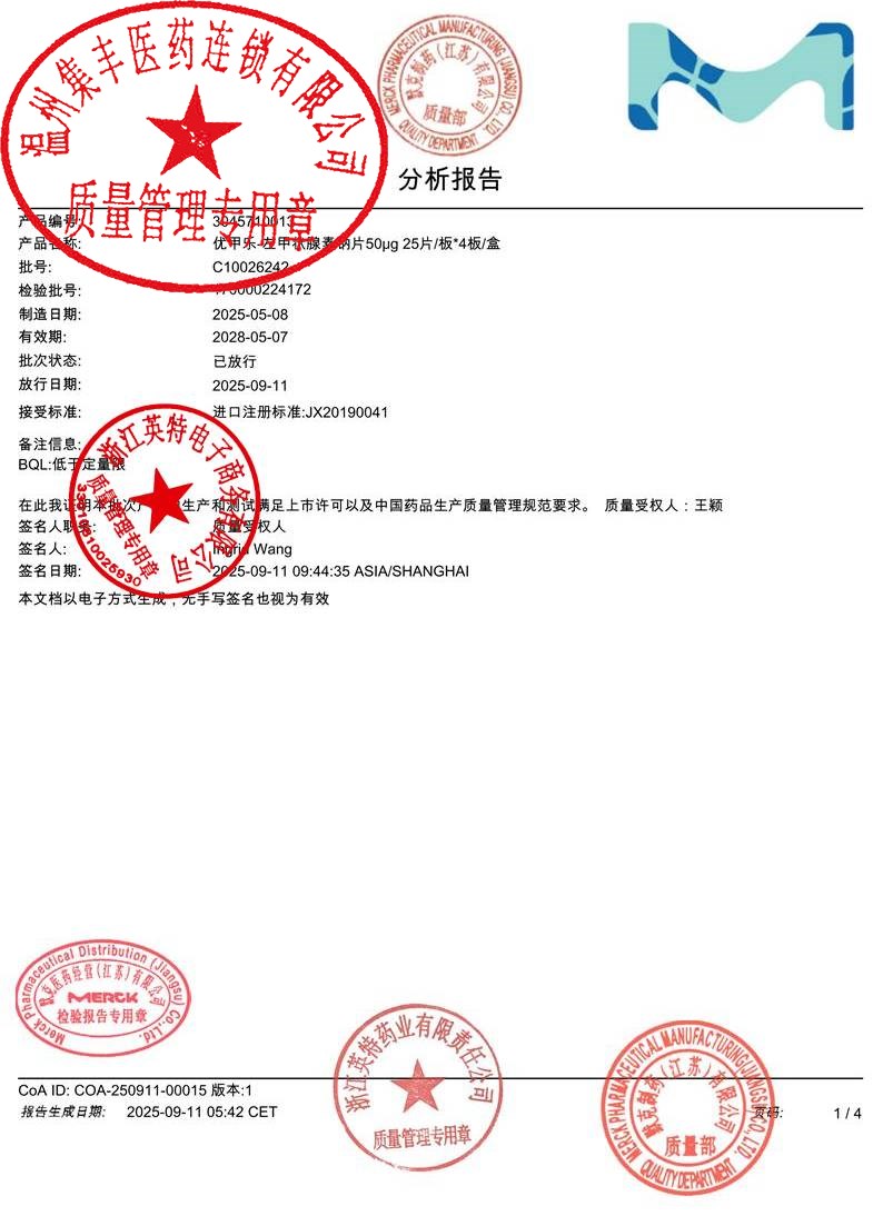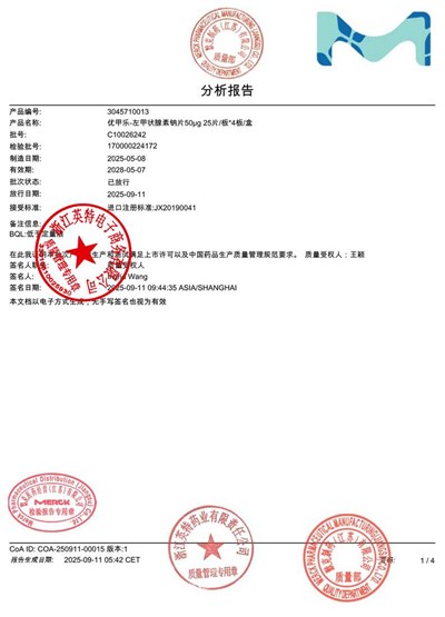 | 9 | 25519 | 左甲状腺素钠片(优甲乐) | 50μg*100片 | C10026242 | 盒 | Merck Healthcare KGaA 默克制药(江苏)有限公司 |     | 打包下载 |