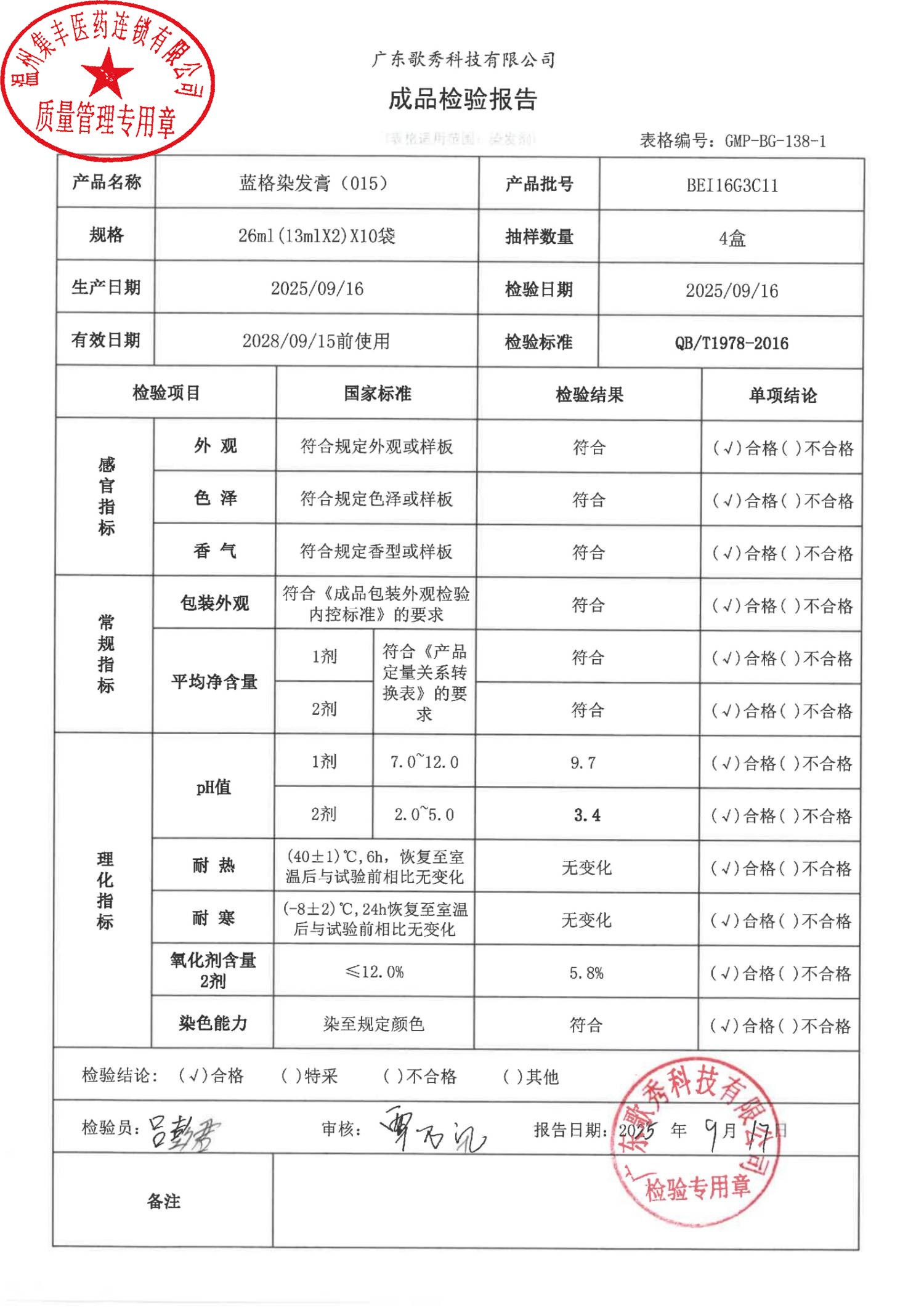 | 7 | 26930 | 蓝格染发膏(015)(栗棕色) | 26ml(13ml*2)*10袋 | BE116G3C11 | 盒 | 广东歌秀科技有限公司 |  | 打包下载 |